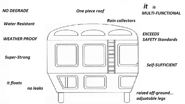 Let’s ponder on its water collection system on its ONE-PIECE Roof … (see: directory / Project it / Designs).